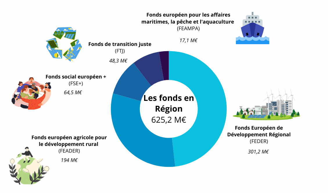 En savoir plus sur les fonds européens : le FEDER, le FSE+, le FTJ, le FEAMPA et le FEADER.